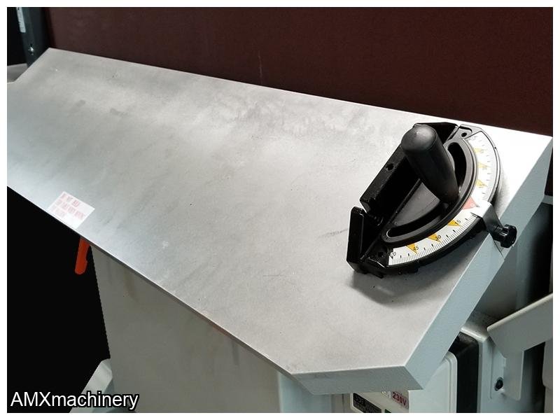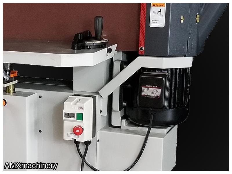 Is designed for the most demanding sanding applications. With its powerful 3HP motor it can perform under industrial requirements. The oscillating belt ensures optimum sanding quality and extended belt life. Its versatility lies in the number of functions which can be done on this single machine.  The industrial cast aluminum table can be easily tilted with positive stops of 45° and -5° so you can easily sand straight or miter edges.  Additionally, the front table is spring loaded making it effortless for the operator to set the table height in order to utilize the full sanding belt.  The 9” high sanding belt makes it ideal for sanding thicker furniture parts or drawer boxes.  The additional tiltable cast aluminum end table with removable guard allows for inside contour sanding.