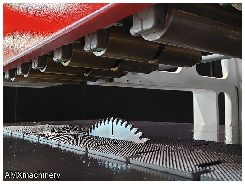 Is designed with performance and added safety in mind. Cutting from below forces the workpiece down on to the feed chain for superior hold down. In addition the blade can project up above the workpiece to allow the gullet to clear the chips which leads to less heat buildup resulting in longer blade life and improved cut quality. Is capable of producing a glue joint cut up to 12 feet. The user friendly floating fence allows the operator to easily line up the material for optimum yield resulting in greater efficiencies. The powerful 20HP direct drive ensures optimum feed rates no matter what material or thickness you are cutting.